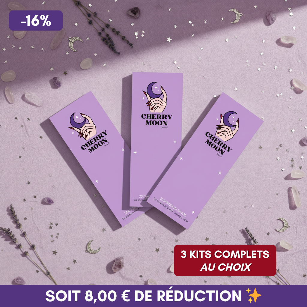 Le Pack Mini Moon avec ses 3 kits au choix, est parfait pour découvrir l’univers Cherry Moon ou compléter tes favoris ! Environ 2 mois de manucures.